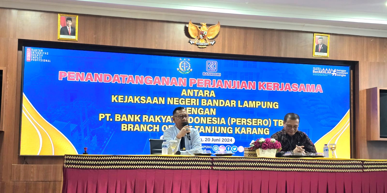 BANDAR LAMPUNG- Bertempat di Aula Kantor Kejaksaan Negeri (Kejari) Bandar Lampung telah berlangsung kegiatan penandatanganan perjanjian kerjasama atau Memorandum of Understanding (MoU) antara PT. Bank Rakyat Indonesia (Persero) Tbk Branch Office Tanjung Karang dengan Kejaksaan Negeri (Kejari) Bandar Lampung tentang penanganan masalah hukum perdata dan tata usaha Negara (TUN) di wilayah hukum Kota Bandar Lampung, pada Kamis (20/6/2024).